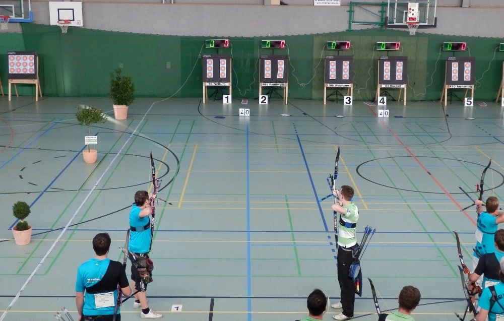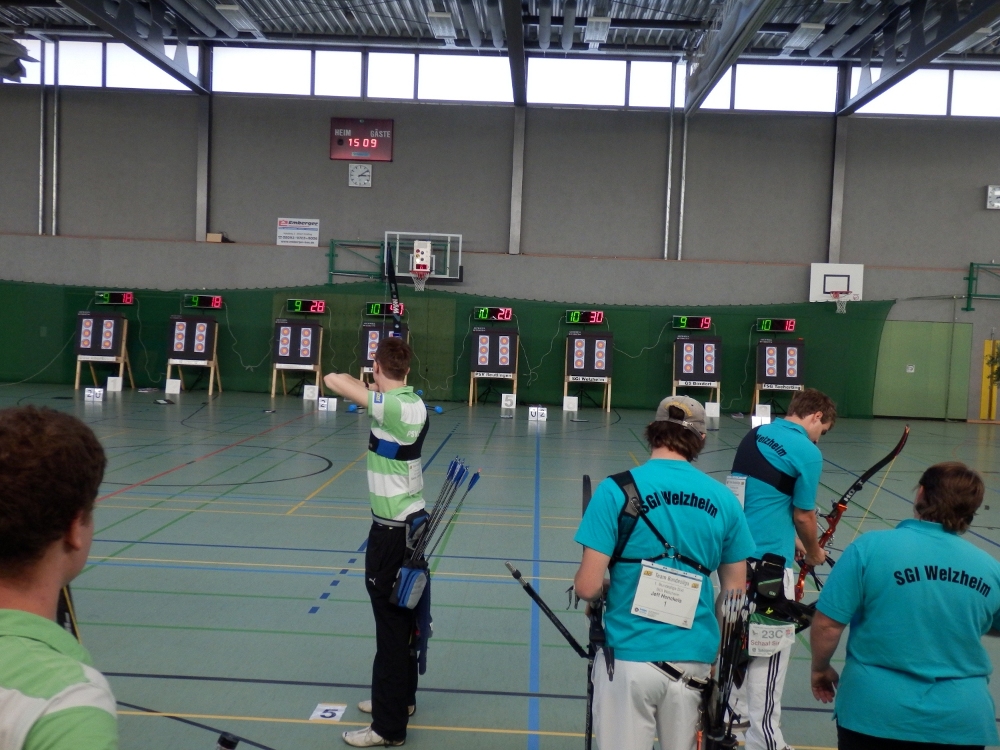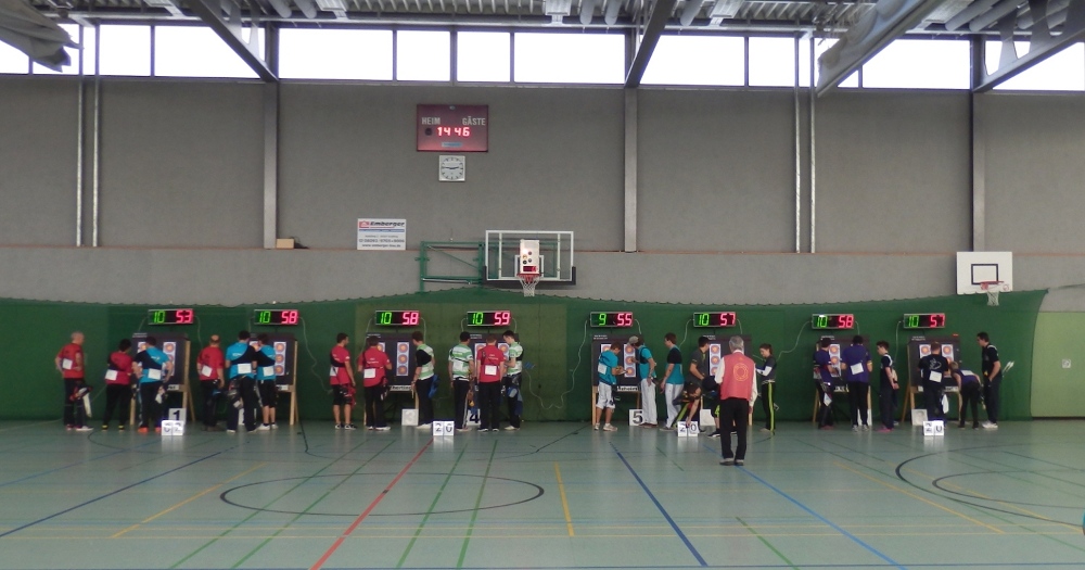 Das Core-Team Sascha, Sven und Adrian wollte dann wie die anderen 7 Teams den ersten Satz beginnen, als nach dem Einschießen in der Halle das Licht ausging. Der Lichtsensor außerhalb der Halle meldete strahlenden Sonnenschein und da gab die bayerische Programmierung der Haussteuerung das Kommando „Licht aus!“, was Mensch nicht überstimmen kann – Scheiß Technik. Etwas konsterniert wiesen die Organisatoren der BSG Ebersberg darauf hin, dass ja jeder die gleichen Wettkampfbedingungen habe und man daher starten könne, das Tageslicht reiche ja aus. Ich dachte nur: Was für ein Mist, hoffentlich passiert uns das nicht, wenn wir in Reutlingen in der Storlachhalle am 7./8.Februar 2015 die Liga ausrichten.